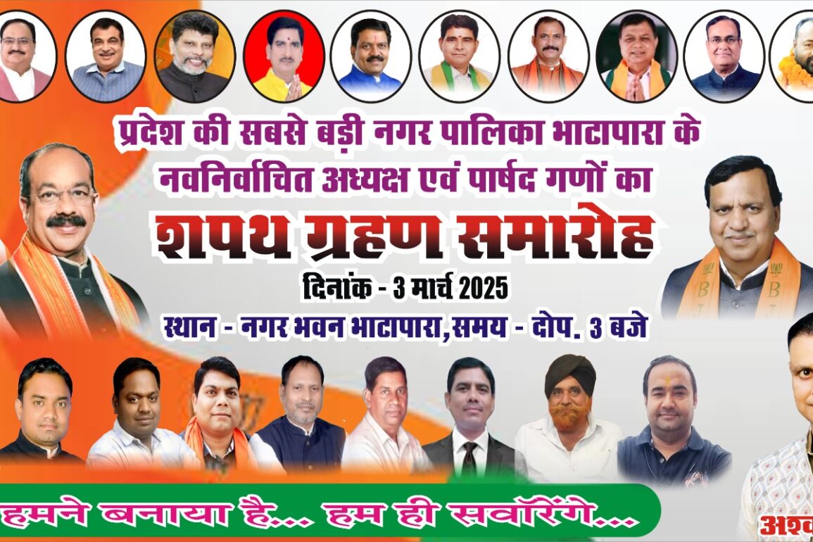प्रदेश की सबसे बड़ी नगर पालिका भाटापारा नगर पालिका (नगपा) के नवनिर्वाचित अध्यक्ष अश्विनी शर्मा एवं सभी पार्षदों को अपर कलेक्टर अभिषेक गुप्ता द्वारा शपथ ग्रहण करवाया गया। निर्धारित कार्यक्रम के अनुसार सायं 5:00 बजे अध्यक्ष अश्विनी शर्मा ने विधिवत शपथ ली।