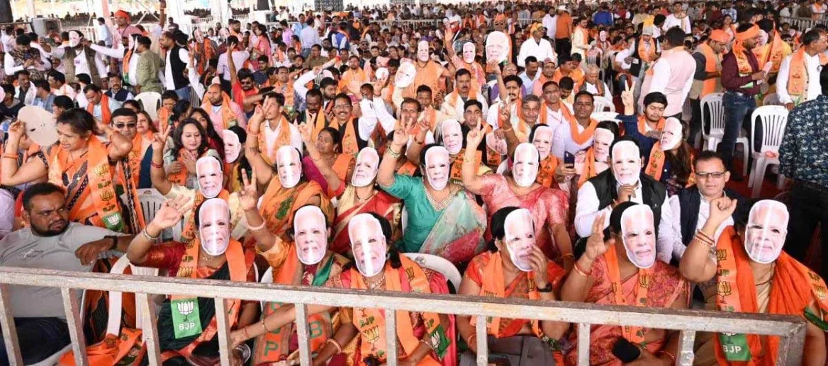शपथ ग्रहण समारोह में प्रधानमंत्री का मुखौटा लगाकर आई महिलाओं में उत्साह दिखा