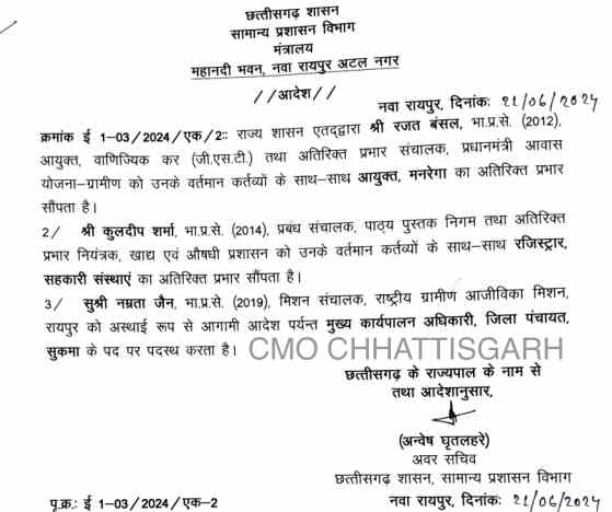 BREAKING : IAS रजत बंसल बनाए गए मनरेगा आयुक्त, कुलदीप शर्मा को मिली सहकारी संस्थाएं रजिस्ट्रार की अतिरिक्त जिम्मेदारी, नम्रता जैन बनीं सुकमा जिला पंचायत सीईओ2 years ago