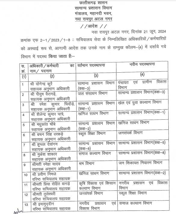 CG TRANSFER BREAKING : सचिवालय में पदस्थ अलग-अलग विभाग के अधिकारियों का हुआ तबादला, GAD ने जारी किया आदेश …2 years ago