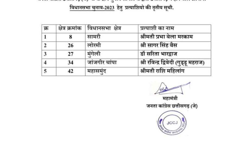 CG BREAKING : जाेगी कांग्रेस की तीसरी सूची जारी, महासमुंद में कांग्रेस समर्थित नपा अध्यक्ष को मैदान में उतारा, लोरमी में सागर को मिला टिकट, देखें लिस्ट…2 years ago