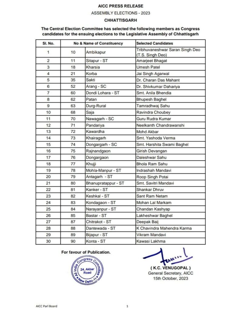 छत्तीसगढ़ विधानसभा चुनाव 2023 के लिए कांग्रेस की पहली सूची जारी