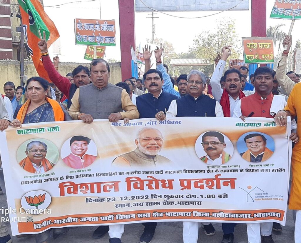 मोर आवास मोर अधिकार के तहत भाटापारा में धरना प्रदर्शन… धरम लाल कौशिक,केदार कश्यप,शिवरतन शर्मा ने हितग्राहियों को किया संबोधित….