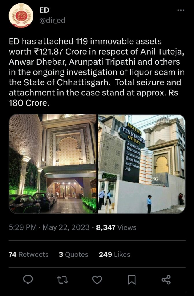 रायपुर: ED ने छत्तीसगढ़ के शराब घोटाले मामले में IAS अनिल टूटेजा, अनवर ढेबर, अरूणपति त्रिपाठी, अरविंद सिंह और विकास अग्रवाल की ₹121.87 करोड़ की 119 संपत्ति अटैच की है। इसमें 14 संपत्ति IAS अनिल टूटेजा की है जिसकी क़ीमत ₹8.883 करोड़ है। पहले ED ने ₹58 करोड़ की संपत्ति अटैच की थी यानी अब तक ₹180 करोड़ की संपत्ति अटैच हो चुकी है। जिसमें अनवर ढेबर का होटल Vennington Court भी शामिल है l