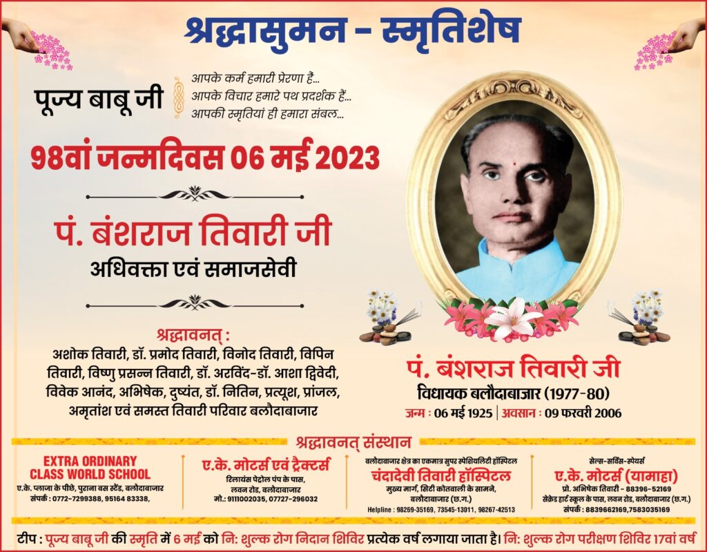 बलौदाबाजार : पूर्व विधायक, अधिवक्ता एवं समाजसेवी स्व. प. बंशराज तिवारी के 98वे जन्मदिवस के अवसर पर चंदा देवी तिवारी हॉस्पिटल बलौदाबाजार में प्रति वर्ष की भांति इस वर्ष भी 6 मई को निःशुल्क रोग परीक्षण शिविर का आयोजन किया जा रहा है जिसकी जानकारी हॉस्पिटल के संचालक एवं पूर्व मुख्य चिकित्सा अधिकारी डॉ प्रमोद तिवारी ने दी उन्होंने बताया की 9 फरवरी बाबू जी के अवसान के बाद से लगातार उनकी स्मृति में 2007 से निःशुल्क रोग परीक्षण एवं उपचार शिविर मेरे एवं परिवार के द्वारा आयोजित किया जाता रहा है जिसे आयोजित करते आज 17 वर्ष हो गए इसमें अभी तक हमने हजारों मरीजों का निःशुल्क उपचार किया एवं सर्जरी जिनमे उनकी सभी तरह की जाँच तथा दवा वितरण बाबू जी की जयंती के दिन निःशुल्क की जाती रही है एवं इस बार भी सभी मरीजों का रोग परीक्षण एवं आवश्यकता पड़ने पर सोनोग्राफी, ई सी जी, खून जाँच, हाइड्रोसील बवासीर का ऑपरेशन साथ ही दवा निःशुल्क दिया जाएगा |