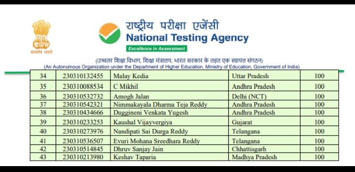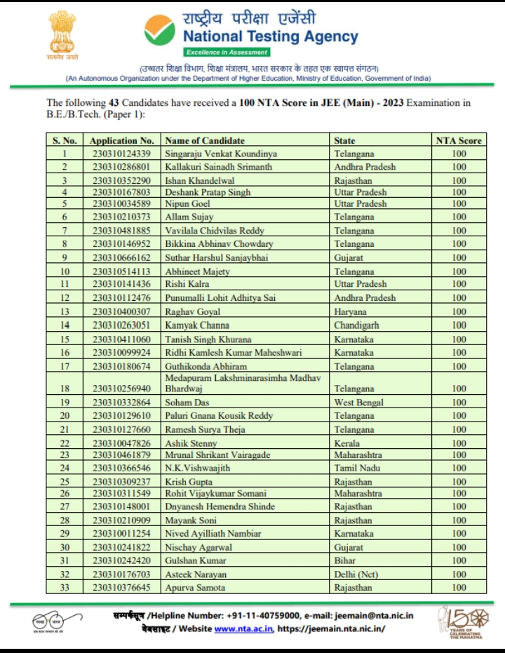 Share thisFacebookXEmailLinkedInWhatsApp दिल्ली:- नेशनल टेस्टिंग एजेंसी (एनटीए) ने JEE (Main) 2023 के लिए अंतिम एनटीए स्कोर घोषित किया। JEE (MAIN) 2023 परीक्षा में 43 उम्मीदवारों ने परफेक्ट 100 एनटीए स्कोर प्राप्त किया है।